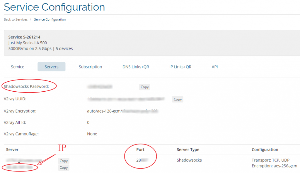 After you sign up, go to ‘Service Configuration’. Find and copy the following: Shadowsocks Password, Server IP address, and port number.